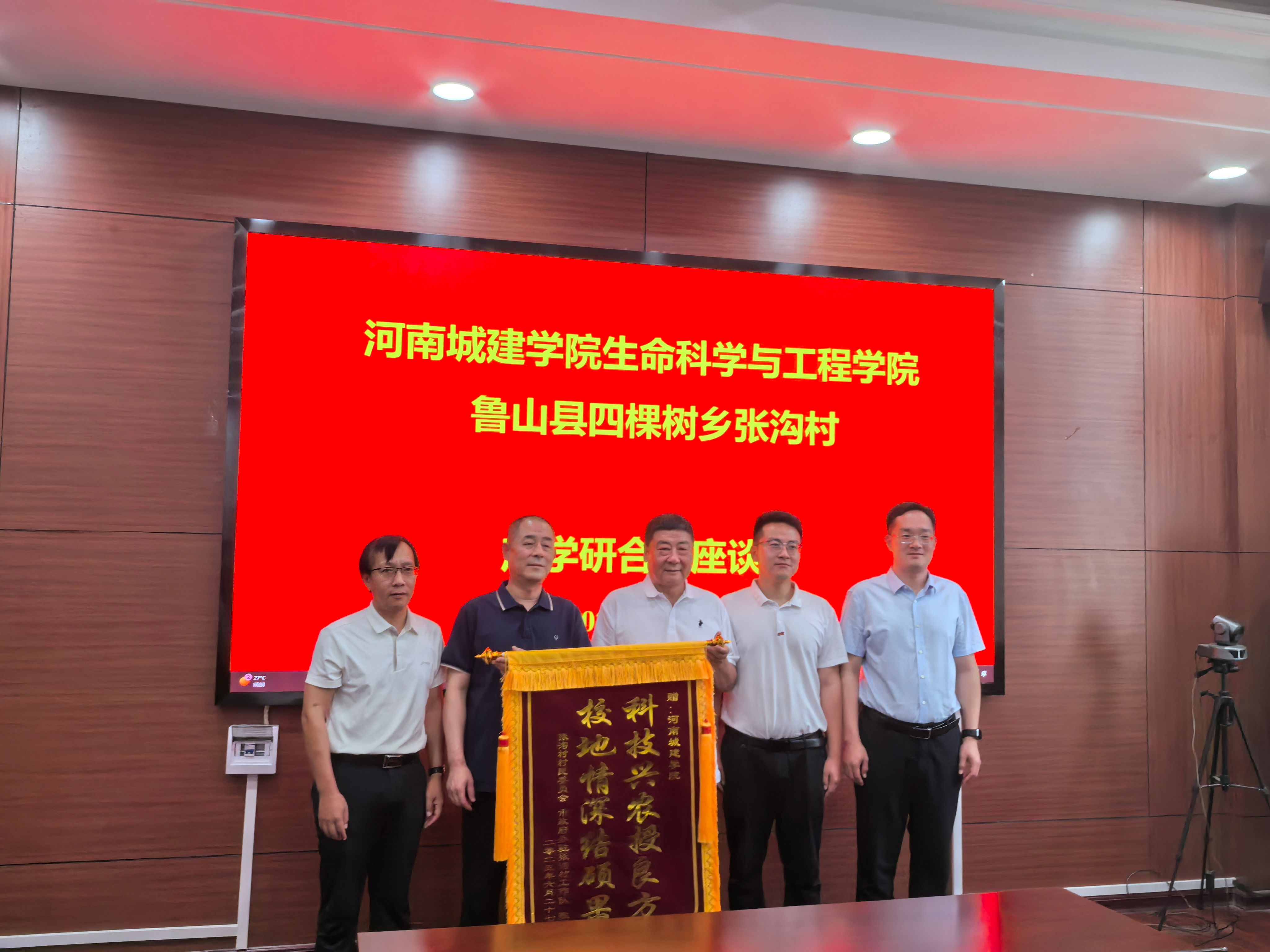 6月27日上午,平顶山市政府办公室副主任柳远、鲁山县四棵树乡张沟村党支部书记许建军和市政府办驻张沟村第一书记郑鑫等一行专程来校,将印有“科技兴农授良方 校地情深结硕果”烫金大字的锦旗送到生科学院,以此表达对我院倾心帮扶、助力乡村振兴的诚挚谢意。双方就进一步深化校地合作事宜进行交流座谈。校机关党委书记、党委组织部副部长孙方行、生科学院领导班子成员及博士代表参加座谈会。会议由生科学院党委书记武二伟主持。