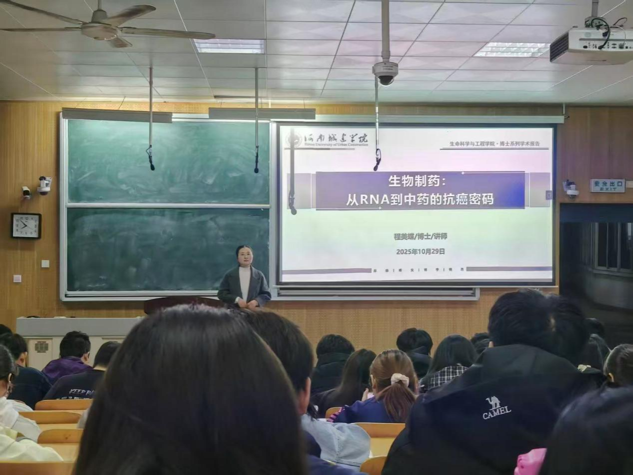 (通讯员 支双成)为帮助新生夯实专业基础、洞察学科前沿,10 月 29 日晚,生命科学与工程学院“博士讲坛” 第八期顺利举行。程美蝶博士以《生物制药:从 RNA 到中药的抗癌密码》为题,为 2025 级生物制药专业新生带来一场兼具理论深度与实践价值的学术讲座。