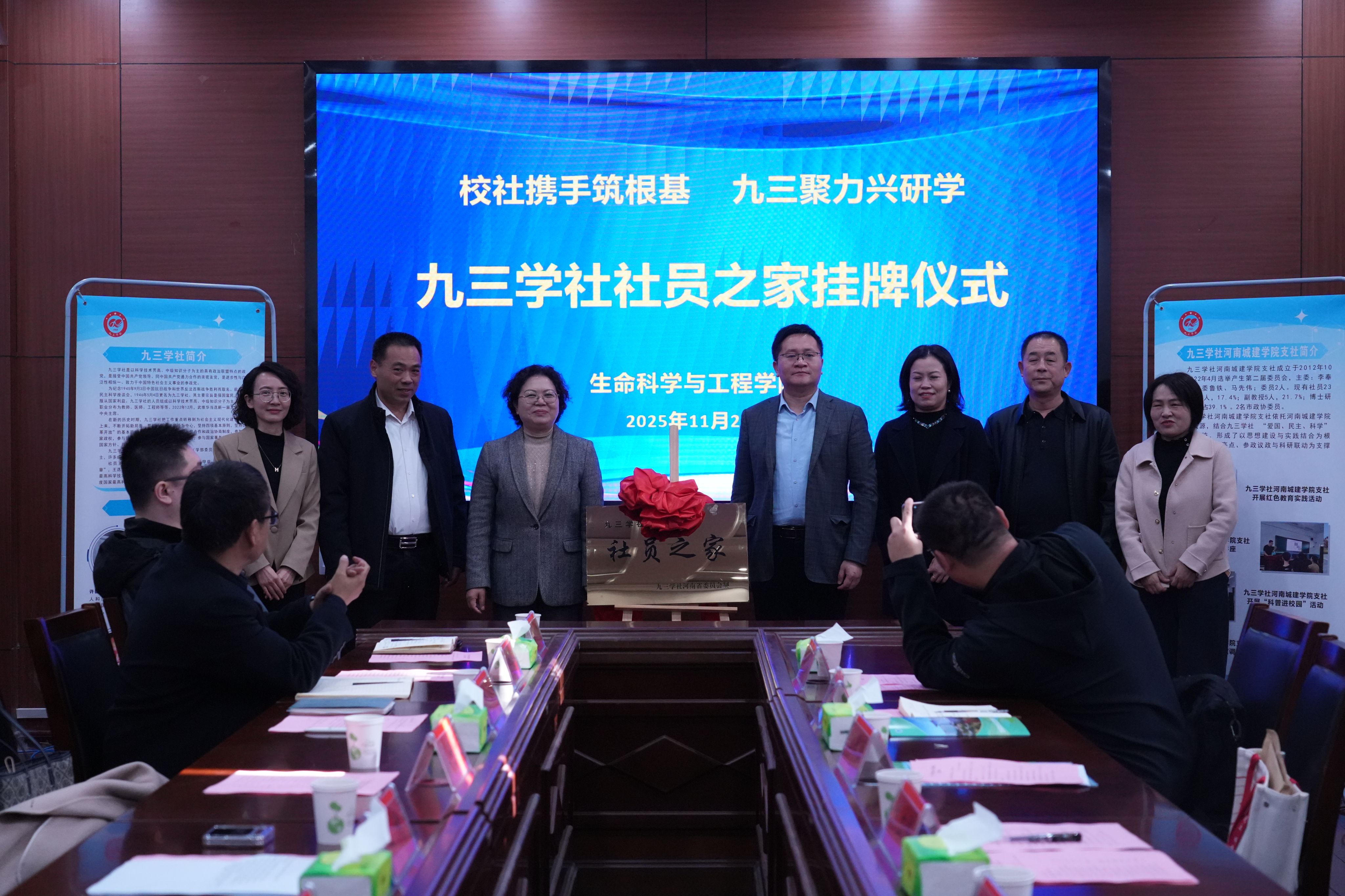 11月27 日上午,九三学社河南城建学院支社“社员之家”挂牌仪式在我校生命科学与工程学院会议室举行。平顶山学院副校长、九三学社平顶山市委会主委米立伟,校党委副书记、工会主席王靖出席仪式并共同揭牌。九三学社平顶山市委会专职副主委张萍,校党委委员、统战部部长张守义,生命科学与工程学院班子成员及兄弟党派代表、支社骨干社员等参加仪式。仪式由生命科学与工程学院副院长朱涛主持。