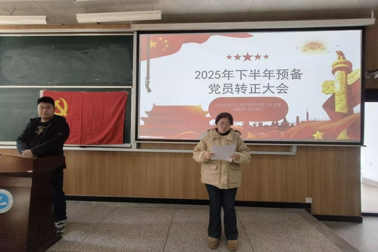 (通讯员 龚乐乐)为扎实做好学生党员发展工作,严格党员发展程序。2025年12月16日,生科学院学生党支部在6#C114召开预备党员转正大会,严格按照组织程序,讨论李卓迅、刘洁、陈隆礼、刘卓、范雨果、董孟帆6名同志由预备党员转为正式党员的相关事宜。本次会议由学生第二党支部书记龚乐乐主持,支部全体学生党员参加会议。